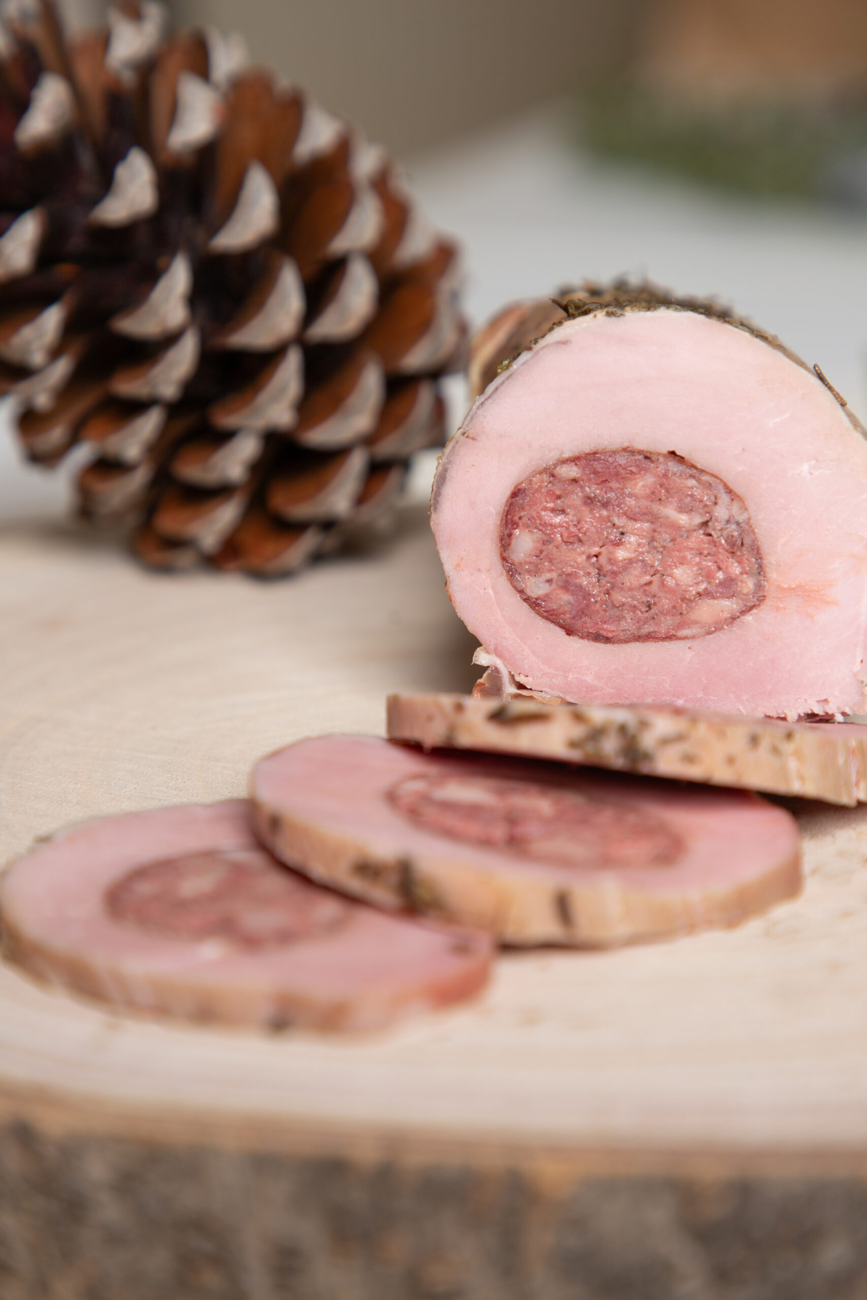 • Composition : Poitrine et épaule de porc, vin blanc, noisettes torréfiées, sel, poivre